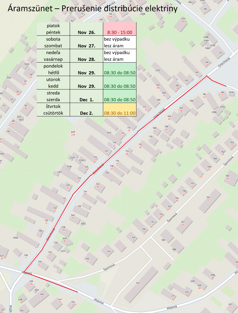 Vážený zákazník, spoločnosť Západoslovenská distribučná, a.s. oznamuje, že z dôvodu vykonávania plánovanej práce na zariadeniach distribučnej sústavy alebo v ich ochrannom pásme, budú bez dodávky elektriny v nižšie uvedených termínoch nasledujúce ulice : Orechová ulica 98 - 138 Hlavná ulica 139 - 142 a Úzka ulica 5. (Z dôvodu, že plánovaná práca postihne viacero miest dodávky, nie je možné oznámený termín meniť. Za vzniknuté nepríjemnosti súvisiace s obmedzením sa Vám spoločnosť ospravedlňuje.)