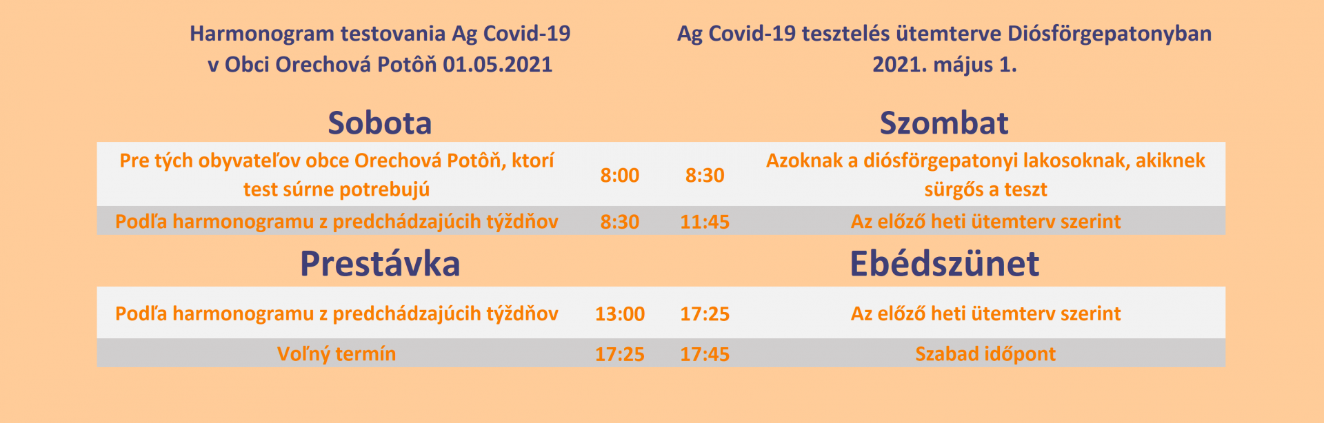Občania obce s trvalým alebo prechodným pobytom v Orechovej Potôni budú testovaní podľa vypracovaného harmonogramu. Ak niekomu z dôvodu pracovných alebo iných dôležitých povinností nevyhovuje pridelený termín, môže sa dať otestovať v sobotu od 8:00 do 8:30, alebo večer od 17:25 do 17:45.