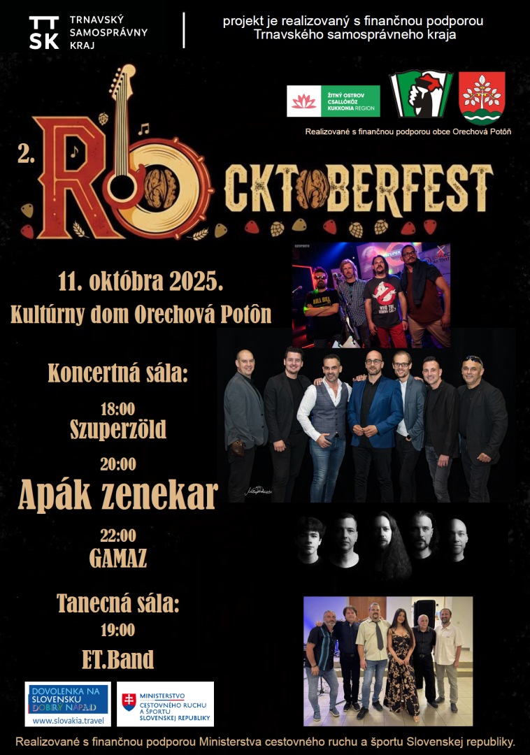 A 2. Rocktóberfeszt tartja magát a koncepcióhoz, hogy helyi kötődésű zenekarokkal szórakoztassa a közönséget. A moziteremben az esemény a dunaszerdahelyi Szuperzöld koncertjével indul, a fellépésük után az E.T. Band retró muzsikája biztosítja a jó hangulatot a bálteremben, ahol táncra, és étel, ital fogyasztására is lesz lehetőség. 8 órai kezdettel az Apák zenekar ad nagykoncertet. Este 10 kor a GAMAZ lép színpadra, előtte utána újra tánc és buli a bálteremben.