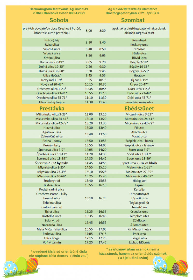 A tesztelésen a Diósförgepatonyban állandó vagy átmeneti lakhellyel rendelkező személyek az ütemterv szerint lesznek tesztelve. Akinek munkavégzés vagy egyéb ok miatt sürgős a tesztelés, az kihasználhatja a reggeli 8:00 és 8:30 közötti idősávot, vagy az esti 17:25 és 17:45 közötti idősávot.