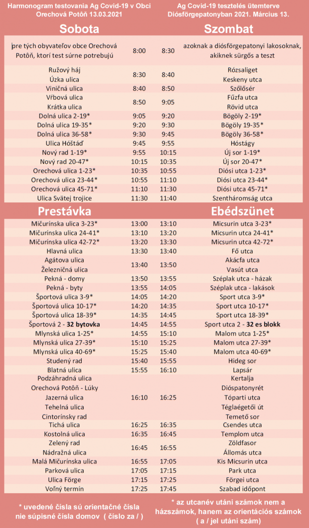 A tesztelésen a Diósförgepatonyban állandó vagy átmeneti lakhellyel rendelkező személyek az ütemterv szerint lesznek tesztelve. Akinek munkavégzés vagy egyéb ok miatt sürgős a tesztelés, az kihasználhatja a reggeli 8:00 és 8:30 közötti idősávot, vagy az esti 17:25 és 17:45 közötti idősávot.