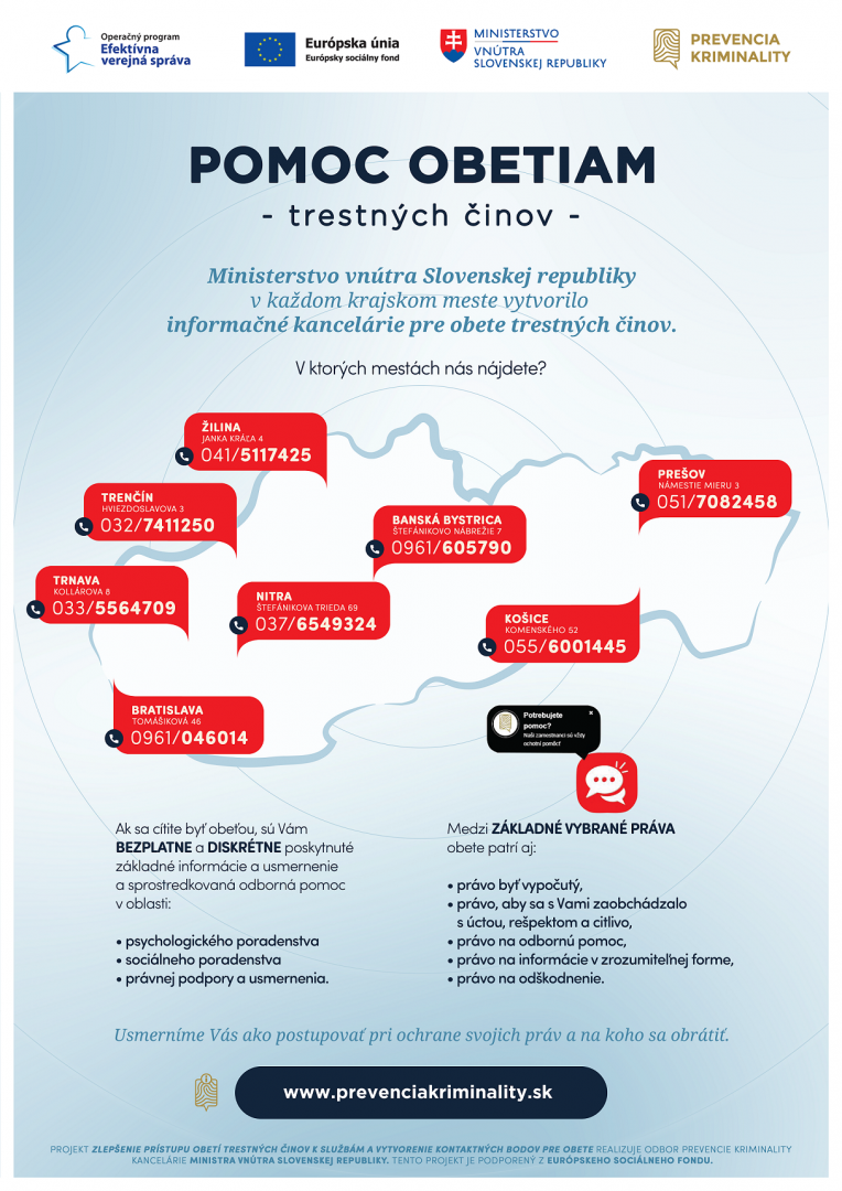 A bűnözés megelőzése érdekében a jelenlegi válsághelyzetben a Szlovák Köztársaság Belügyminisztériumának Bűnmegelőzési Osztálya úgy határozott, hogy elkészít egy szórólapot azoknak az állampolgároknak, akik úgy érzik, hogy bűncselekmény áldozatai lettek, és amely általános információkat tartalmaz, például arról, hogy hol és hol tudnak segítséget kérni az áldozatok.