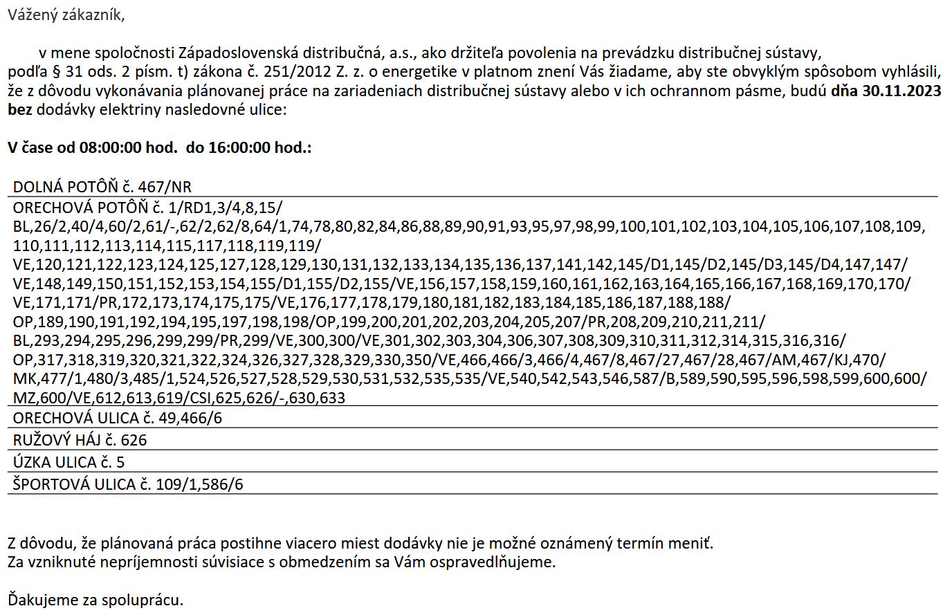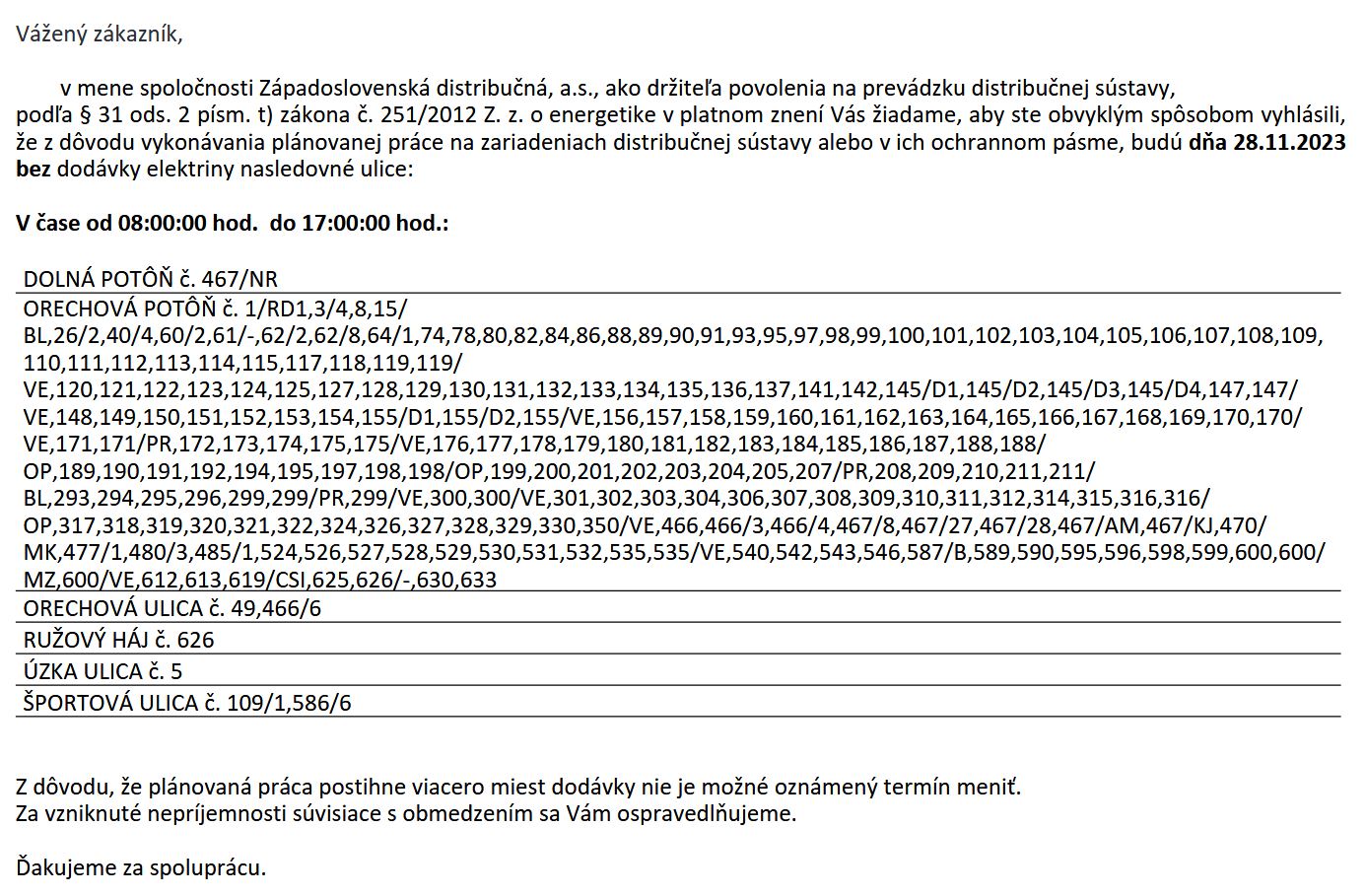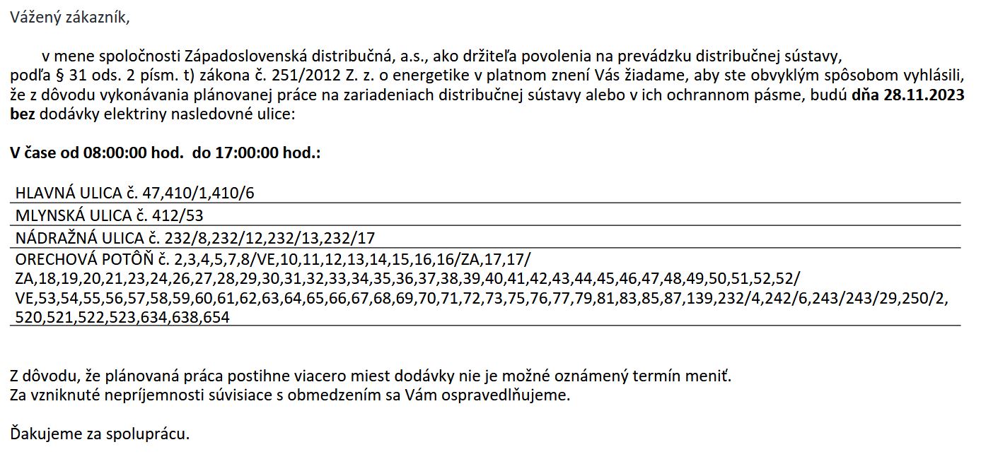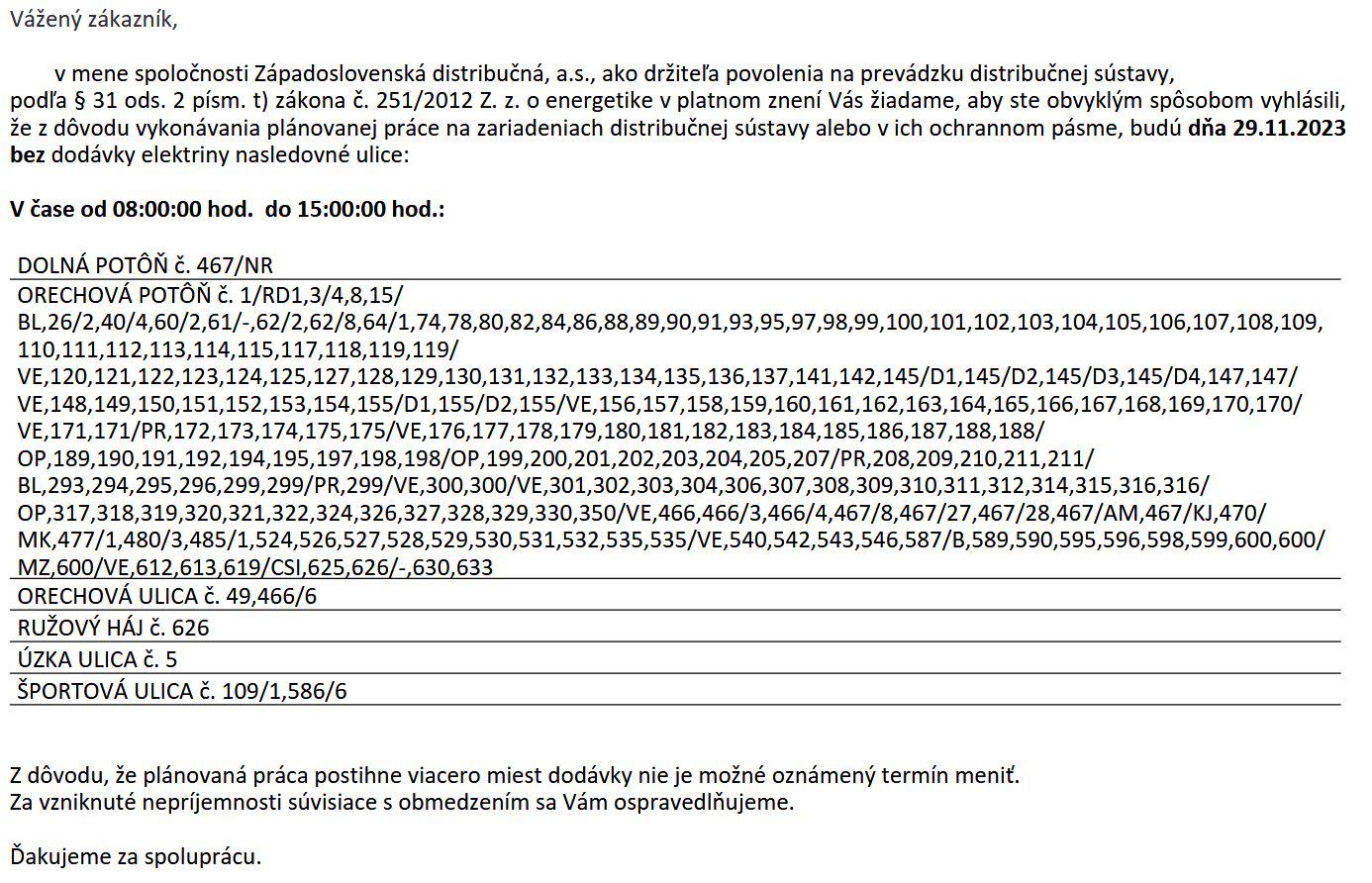Egyúttal tájékoztatjuk, hogy a villamosenergia-szolgáltatás szüneteltetése az Ön ellátási helyére történő villamosenergia-szállítás elmaradásával jár, ezért kérjük, hogy tegye meg a megfelelő intézkedéseket a károk bekövetkezésének megelőzése érdekében, mivel a Západoslovenská distribučná, a.s. nem felel a fent említett okból eredő károkért és elmaradt haszonért. Tekintettel arra, hogy a tervezett munkálatok több ellátási pontot is érintenek, a meghirdetett időpont megváltoztatása nem lehetséges.