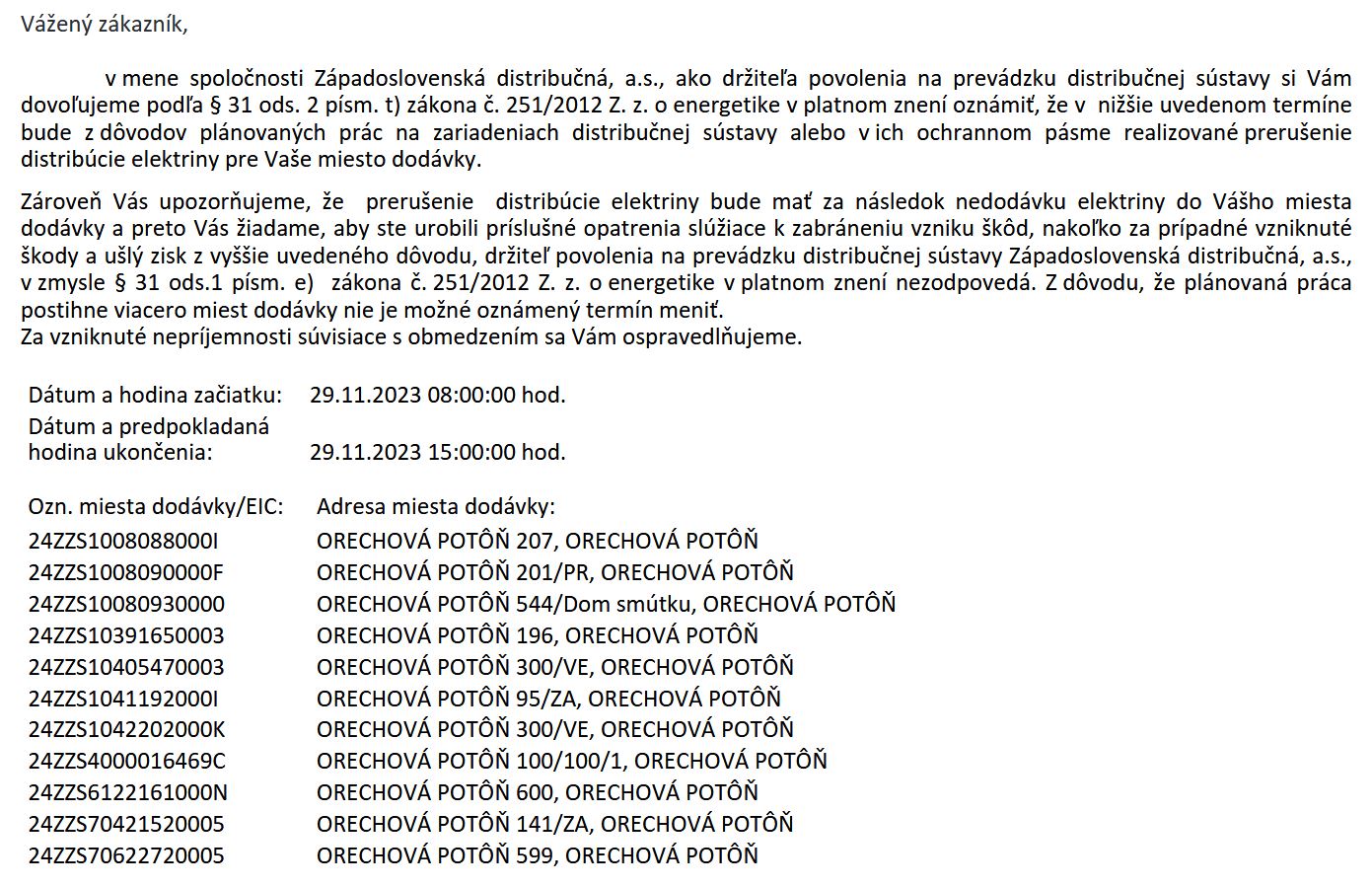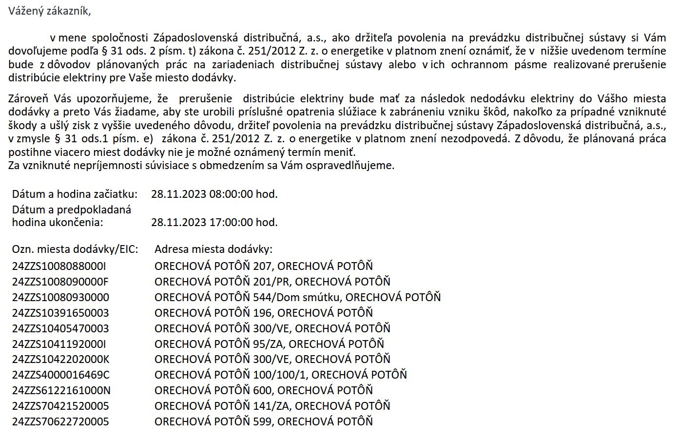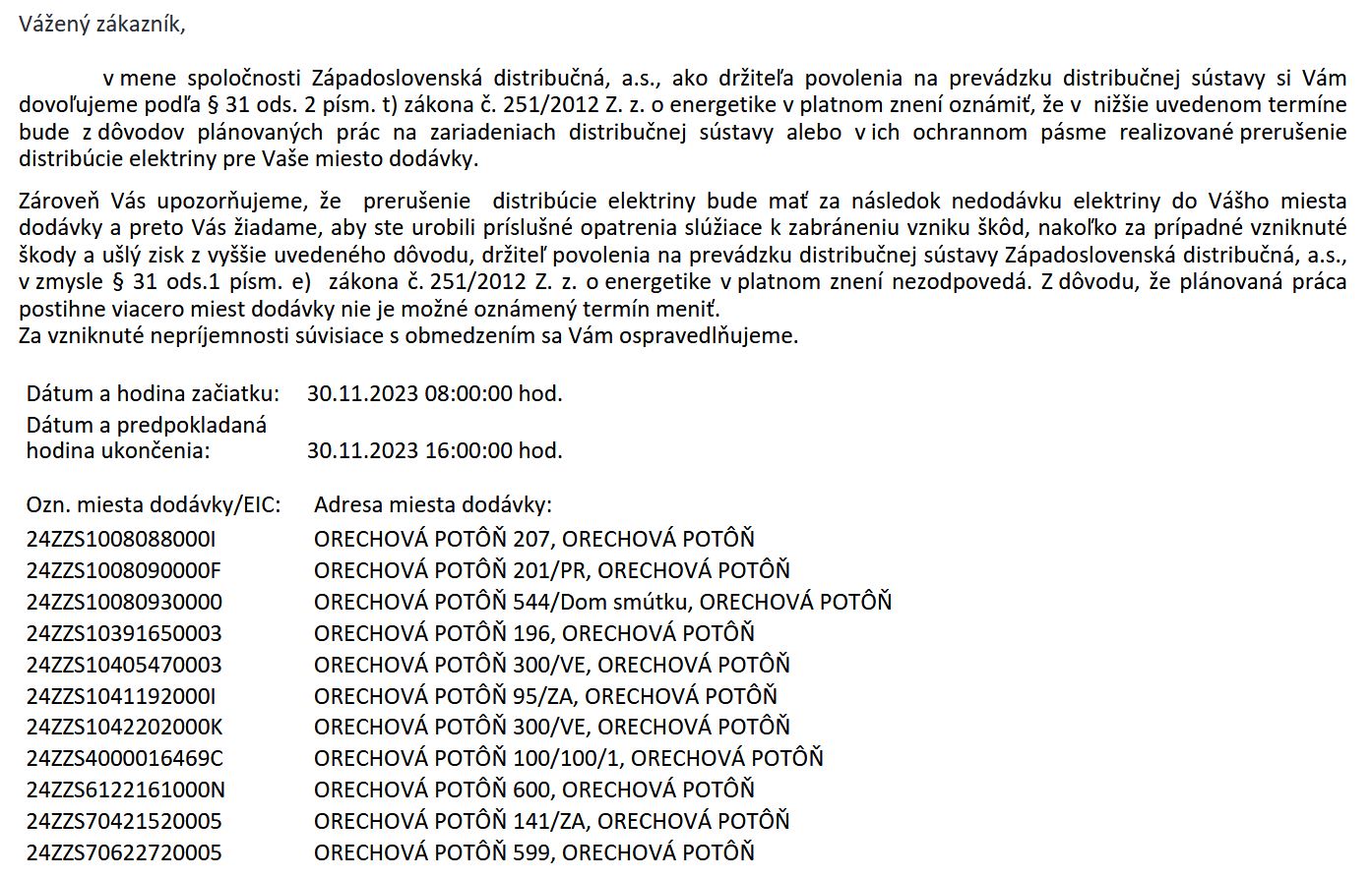Egyúttal tájékoztatjuk, hogy a villamosenergia-szolgáltatás szüneteltetése az Ön ellátási helyére történő villamosenergia-szállítás elmaradásával jár, ezért kérjük, hogy tegye meg a megfelelő intézkedéseket a károk bekövetkezésének megelőzése érdekében, mivel a Západoslovenská distribučná, a.s. nem felel a fent említett okból eredő károkért és elmaradt haszonért. Tekintettel arra, hogy a tervezett munkálatok több ellátási pontot is érintenek, a meghirdetett időpont megváltoztatása nem lehetséges.